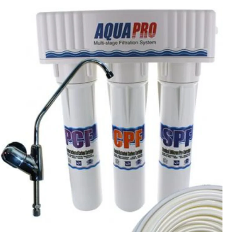 دستگاه تصفیه آب خانگی سه مرحله آکواپرو AQUAPRO Multi-stage یک سیستم تصفیه آب جمع و جور برای فیلتر کردن آب آشامیدنی زیر سینک آشپزخانه با قابلیت اتصال به یخچال ساید.این سیستم فیلتراسیون با یک شیر 1/4 اینچی و تمام لوازم جانبی که نصب آن در چند دقیقه انجام می شود.با استفاده از این سیستم فیلتراسیون ، آب آشامیدنی شما طعم بهتری ، بدون کلر و شفاف می شود. این سیستم به شما امکان نوشیدن آب تصفیه شده با کیفیت خوب را می دهد.نصب سریع.مواد با FDA CFR21 مطابقت دارند.ساخت تایوان